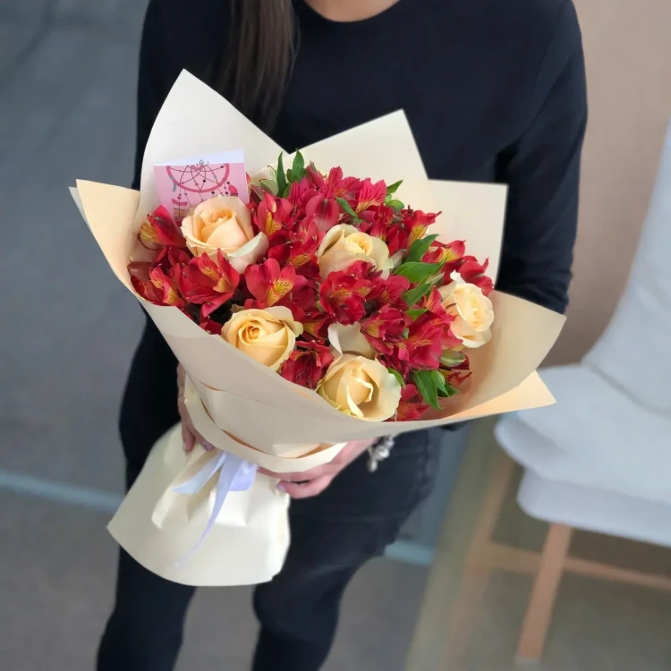 Нежные благоухающие розы и роскошные альстромерии великолепно сочетаются, создавая приятное зрелище и душевное наслаждение. Прекрасно дополненные листьями, цветы этих брусниковых оттенков расцветают в крафтовой упаковке, подчеркивая их естественную красоту. Букет "Элегантный" сразит вас своим очарованием, словно волшебный аккорд музыки, заставляющий сердца замирать.